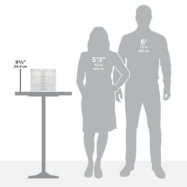 Control everyday clutter and keep desks, countertops, and shelves clear and organized with Sterilite Countertop Drawers! These multi-purpose storage solutions can be used in any room of the home, for crafts, office supplies, jewelry, first aid supplies, beauty items, and more. The 3 Drawer Unit features three clear drawers that neatly contain items but still allow contents to be easily identified. The drawers conveniently hold 8 1/2" x 11" paper. Ideal for keeping smaller items sorted and stored for easy access where they are used most often. The classic styling complements any decor. Multiple units can stack on top of each other to create customized storage solution. The overall assembled dimensions of this item are 13 1/2" D x 11" W x 9 5/8" H.