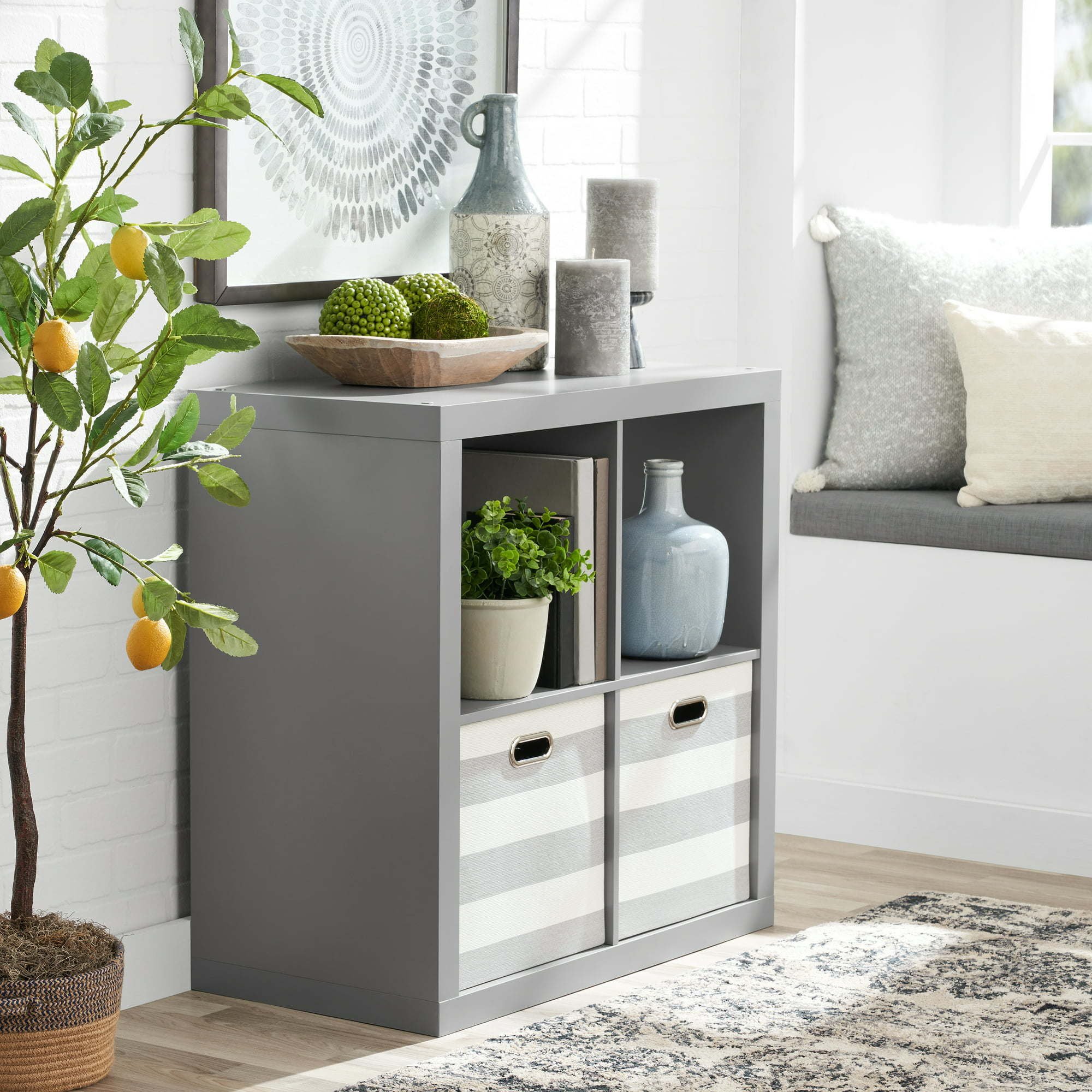 Enhance both functionality and style in your home with the 4-Cube Storage Organizer. Available in various finishes, this organizer showcases four compartments measuring 13" x 15" x 13", providing ample space for showcasing books, collectibles, photographs, artwork, and utilizing storage bins and baskets. The open back design facilitates easy management of cords and cables for electronic devices. With a top panel capable of supporting up to 100 lbs and each cube space supporting up to 30 lbs, this sturdy bookcase offers durability and reliability. Combine it with other cube organizers and storage bins to create a comprehensive storage and display system (sold separately). With included assembly instructions, this 4-Cube Storage Organizer from Better Homes & Gardens is easy to assemble and perfect for various settings such as offices, living rooms, dens, playrooms, and more.