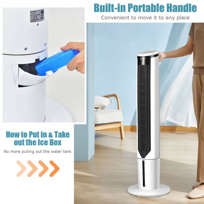 3 wind speeds and 3 wind modes meet various requirementsThe multifunctional design combines an air cooler, fan, and humidifierEnjoy a comfortable sleep with a 9-hour timer and 45dB low noiseClear display screen and smart touch panel for convenient use0.66-gallon water tank with enough water can last several hours for one timeTransparent water level provides accurate residual water information45W cooling power can save more energy than using air condition70° wide oscillating offers wide-angle and long-distance air supplyThe remote control is convenient for you to control the tower fan4 ice crystal boxes are included for a better cooling effectThe bladeless design ensures the safety of your baby and petsThe display screen can be turned off manually or automaticallyThe built-in handle makes the fan easy to move from room to roomSuitable for various places, like the living room, bedroom, office, etc