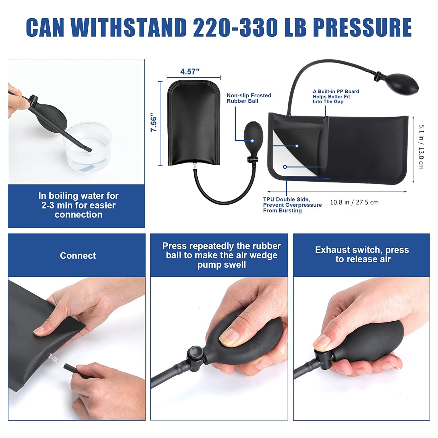 Made of high quality TPU material. Rounded corners; hard and durable edges; smooth exterior; hard PVC sheet in the middle for easier insertion to resist greater pressure. A simple squeeze pump and precise deflation valve help you lift and lower to the perfect position. Inflatable airbags are suitable for windows; doors; cabinet installation; appliances and plumbing. Note: Do not over-inflate to avoid damaging the airbag.
