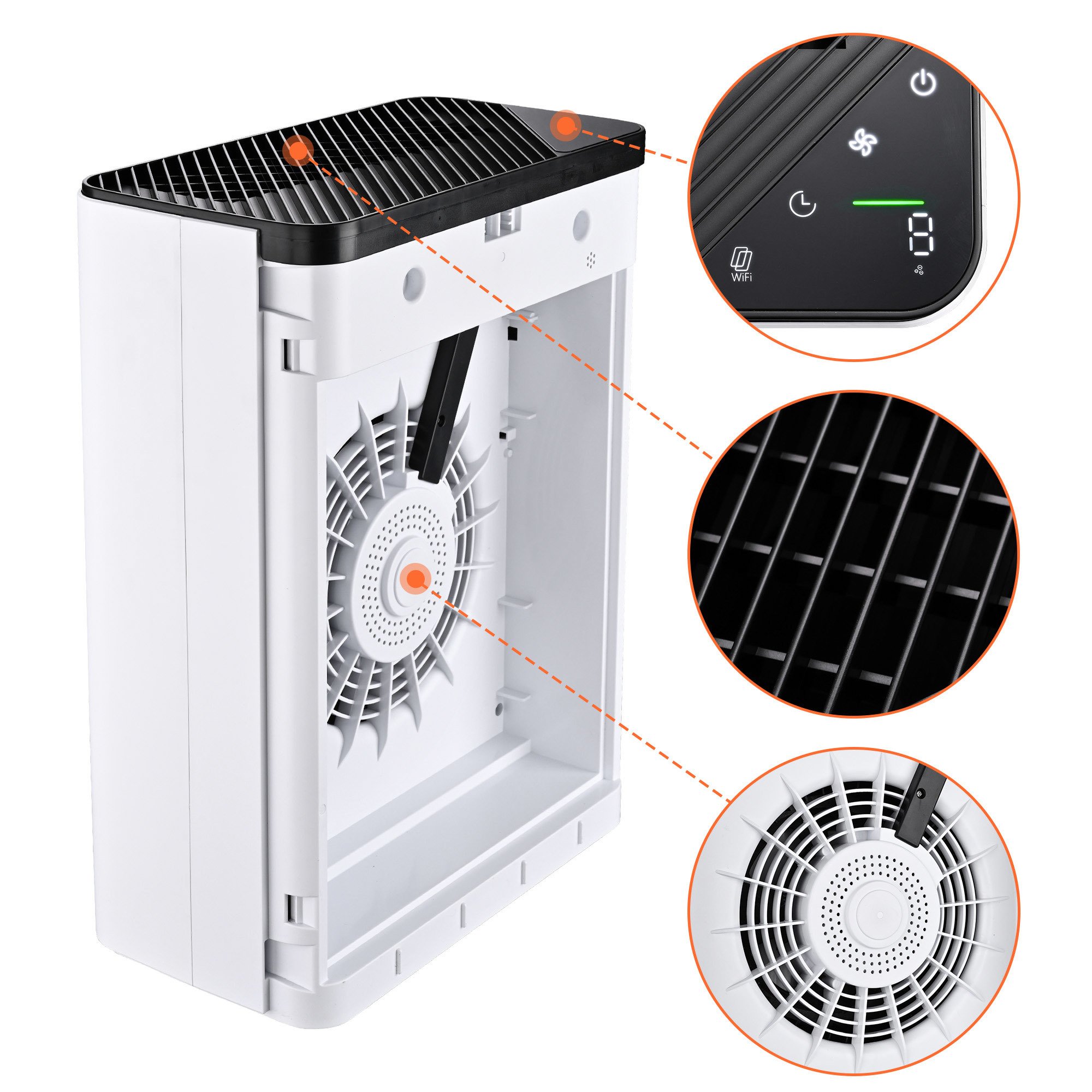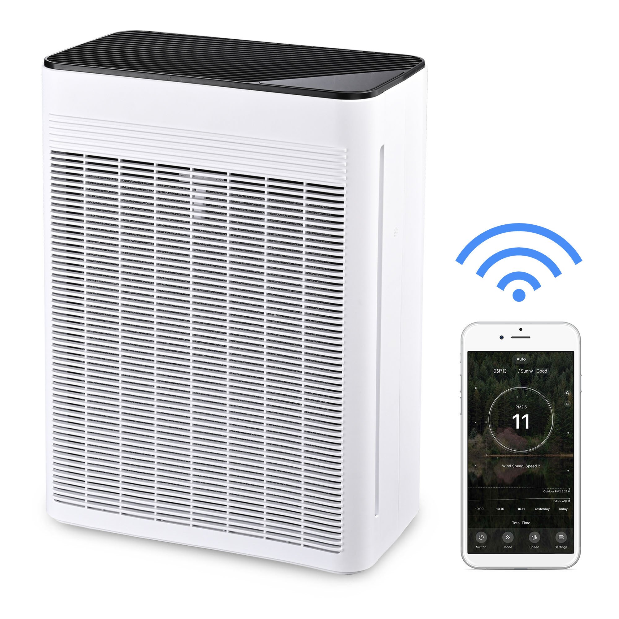 - APP Control & Touch Panel - Connecting with WiFi & Bluetooth; the purifier can be conveniently controlled with just one tap on the APP wherever you go inside the room; With an LCD touch panel for making it easy to turn on the power; adjust the fan speed & set up timers to your need