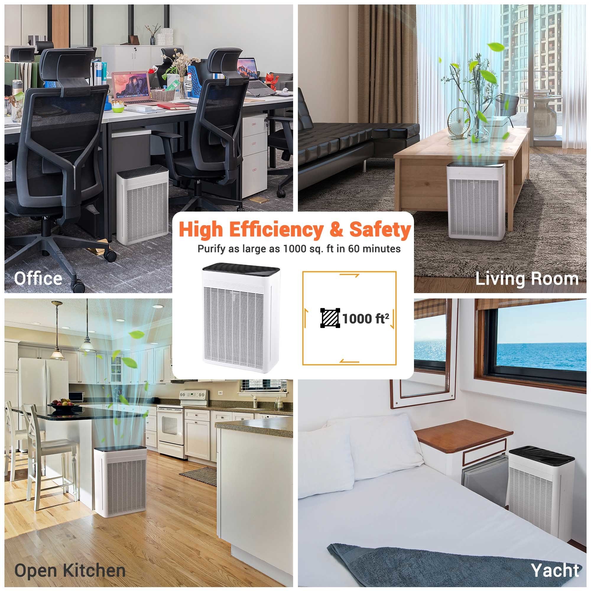 - High Efficiency& Safety - Generates stronger airflow to purify indoor air with a CADR rating of up to 200 m³/h; cleaning a room up to 1000 sq. ft. in 60 minutes; perfect for home; bedroom; kitchen; living room; garage; office; RV; CE; UL & CARB certificated for meeting electrical safety & ozone emission requirements