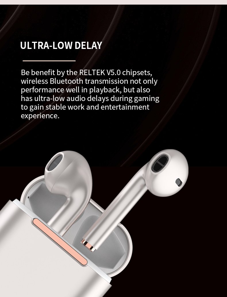 Introduction: 1.New Bluetooth 5.0 chip2.10MM large speaker unit, shocking sound quality.3.Bluetooth distance: 10M4.Type: TWS wireless bluetooth headset5.Charging capacity: 300Mah6.Talk: 2-3 hours7.Power of the left/right earphone: 30Mah8.Battery life Use with charging compartment:50 hours9.Music:5 hoursPackage list:2*headphone1*Instruction1*charging cable