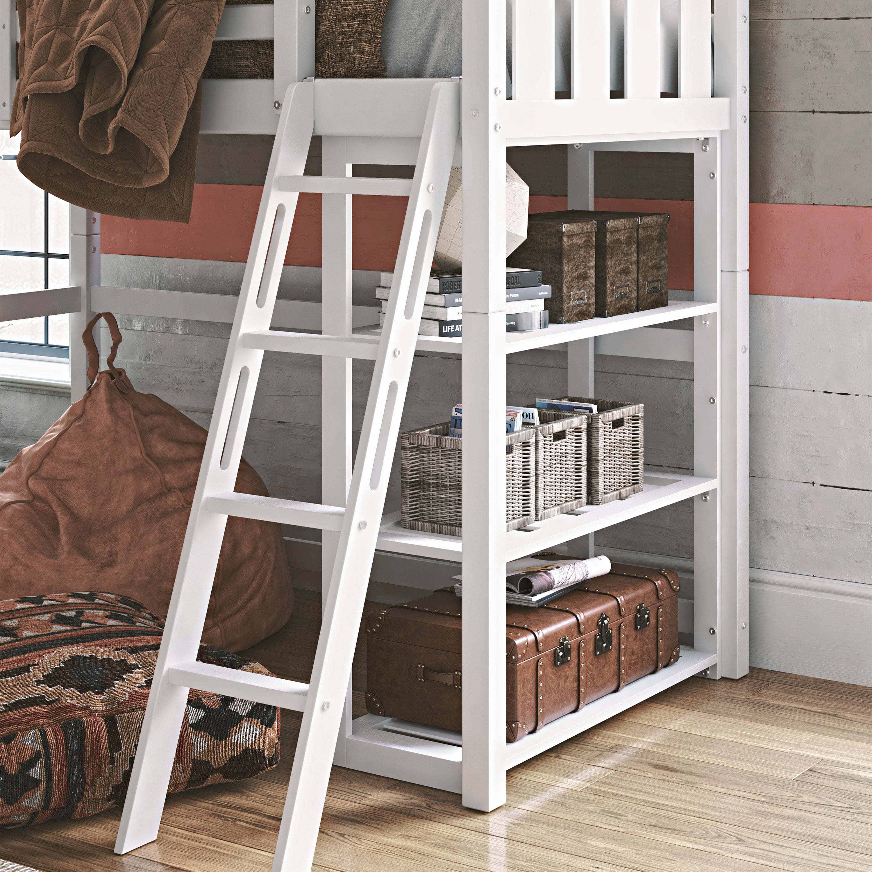 Kane Twin Loft Bed features a traditional style for a classic look in any bedroom. The elevated platform is complemented by an open-shelf bookcase that maximizes space in your home. Store children's toys, books, craft materials, and more on the three shelves. Kids will love the free space the lofted bed creates to play, study, and spend time! The solid wood construction creates high quality and durable foundation for your kids. The lofted bed features clean and simple lines to match most any decor. Wooden mattress slats are included to support a standard twin-size mattress, eliminating any need for a box spring. The Kane is equipped with guardrails to keep the lofted bed secure and safe and an easy-to-climb ladder, leaving parents worry-free while their child sleeps. Available in an array of finishes to fit any style. Coordinates with the Kane Full-Size Bed (sold separately) to create the Kane Twin Over Full Bunk Bed.