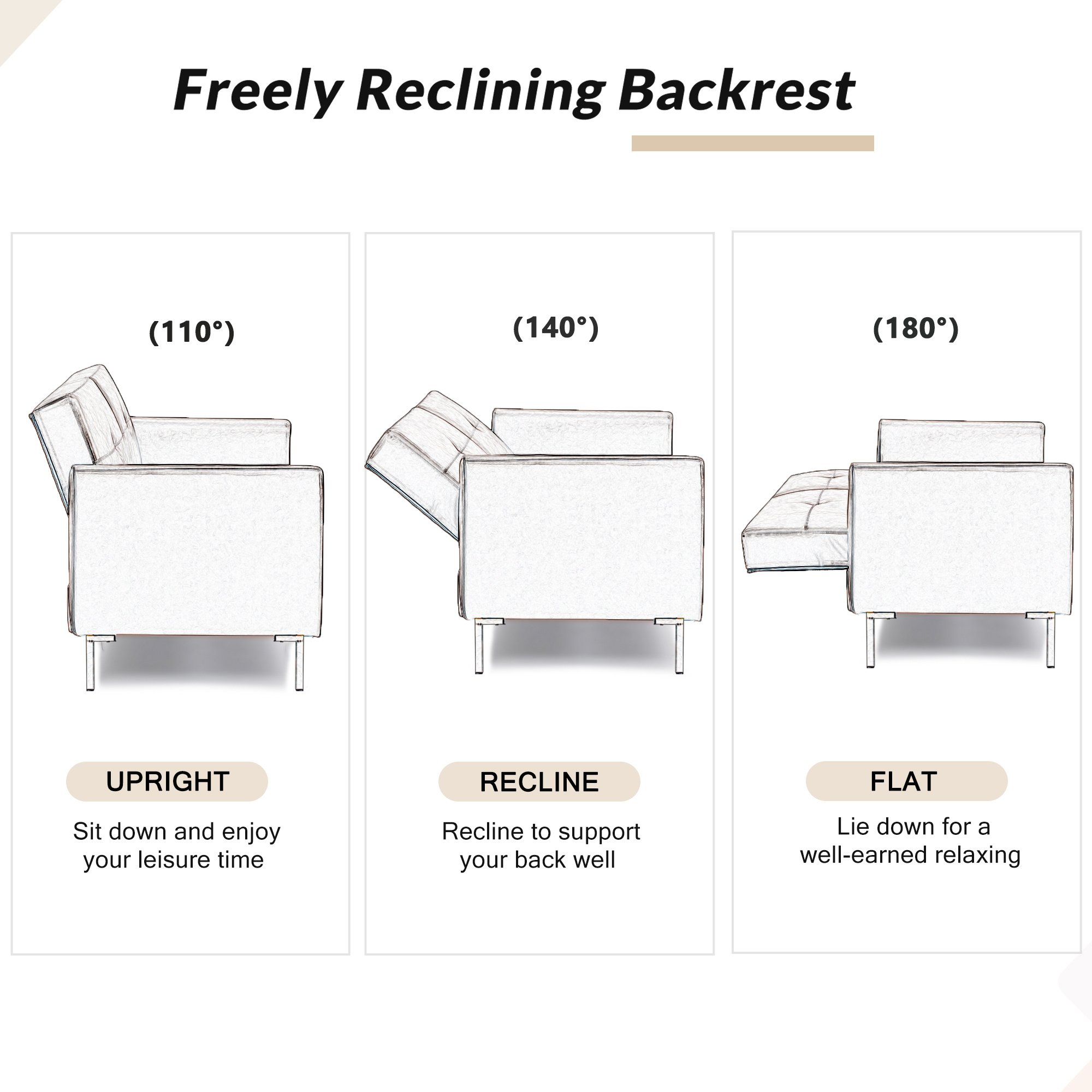 ✔Multiple Adjustable Positions: 3 adjustable positions can offer different comfort to you; if you want to watch TV in your living room you can adjust the back rest to 140 °; if you want to take a nap you can adjust the angle to 180 ° as a bed.✔Firm and Sturdy: Strong wood frame wrapped by supportive foam and durable linen fabric; this loveseat couch offer a great support with weight capacity of 400 lbs.✔Comfortable Seat Cushion: fine linen material; seat cushions filled with high resilience foam and linen fabric wadding provide comfortable support for your body when seated; and easily regain their shape when you rise.✔Perfect for Small Space: Don't lost style in your small rooms or compact spaces! Feature as tufted design; this small couch adds mid-century charm to your small apartment; dorm; living rooms or loft while its streamlined silhouette arms fuse together to make a modern look.