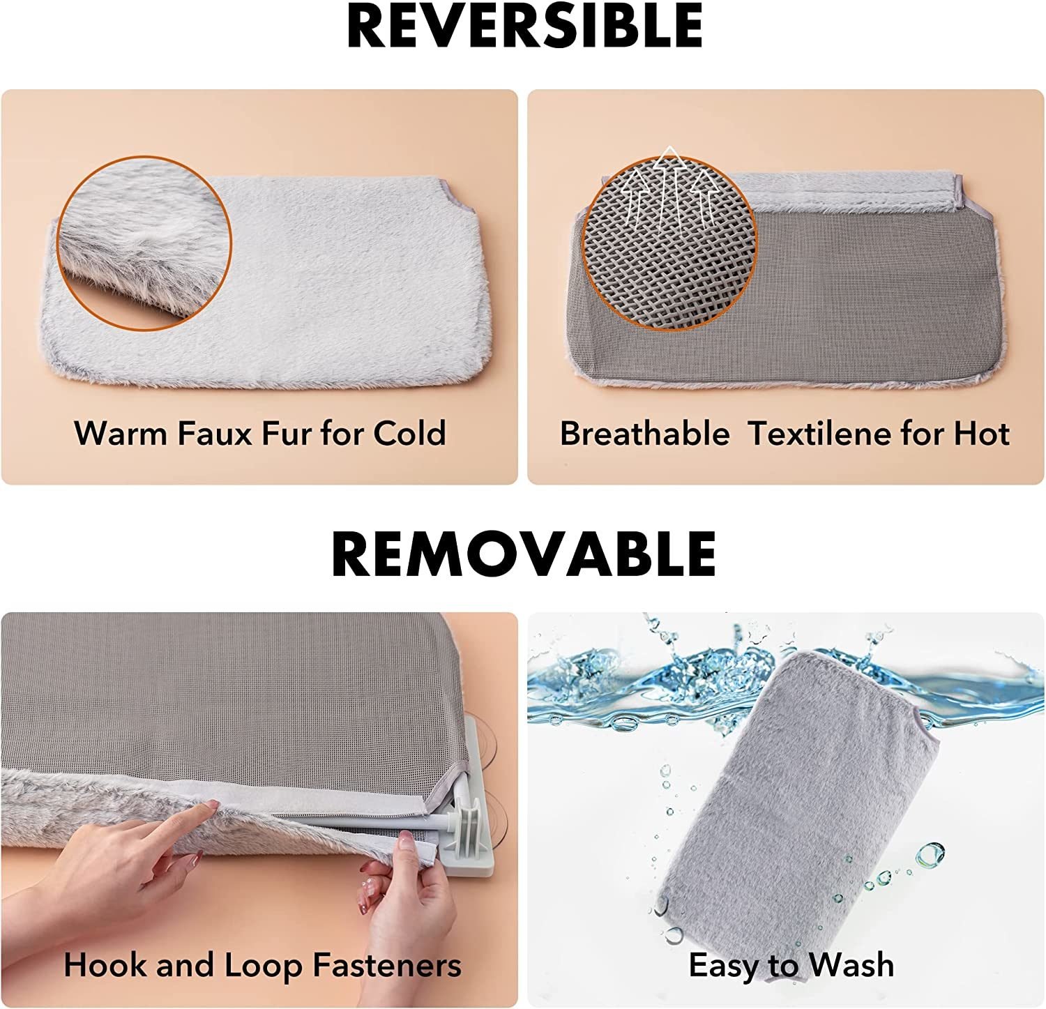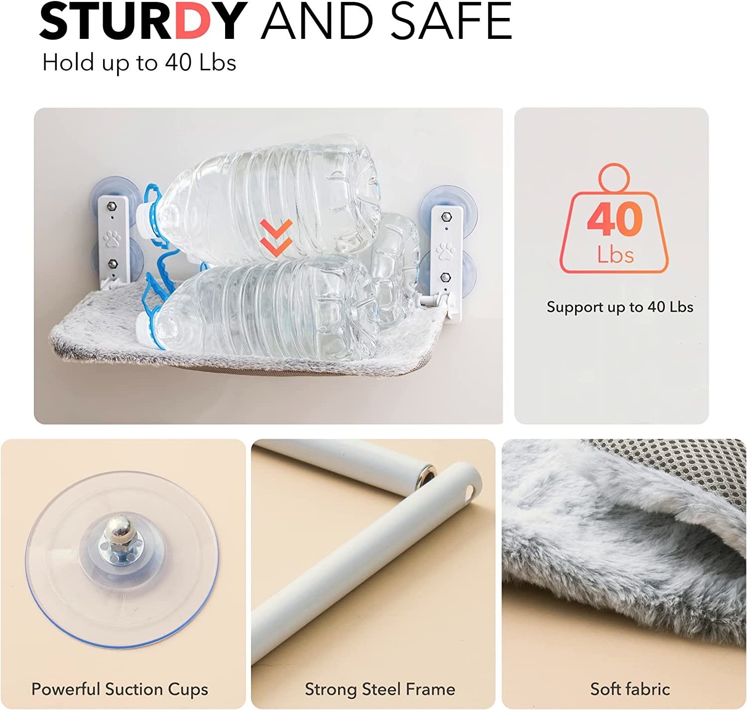 1. Superior Materials: The frame is made of high-grade steel instead of plastic; and the large suction cups hold the cat widnow bed firmly in place.It can hold up to 40 pounds; and the mat is reversible.