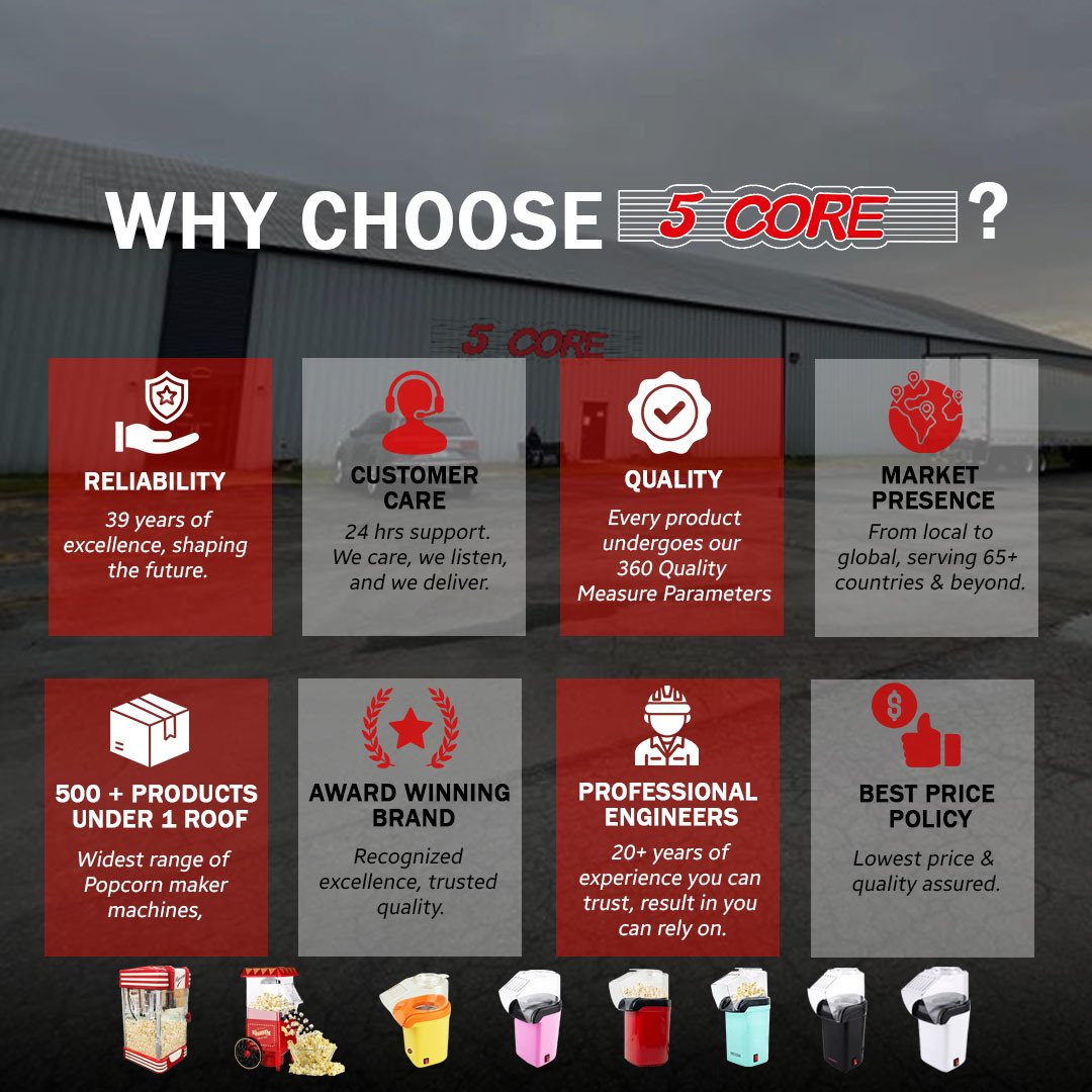 Healthier:The 5 Core popcorn maker uses hot air to pop popcorn without the need for added oils or preservatives; making it a much healthier option.Fully Popped Popcorn:Say goodbye to half-cooked kernels! With a burst rate of 98%; this popcorn machine produces almost fully popped and fluffy popcorn.Multifunctional:The measuring cup that comes with the popcorn popper doubles as a butter melting tray; making it easy to add flavor to your popcorn.Easy to Clean:When you are done with the popcorn maker; cleaning it is a breeze; simply wipe it with a damp cloth and let it dry. That's it!