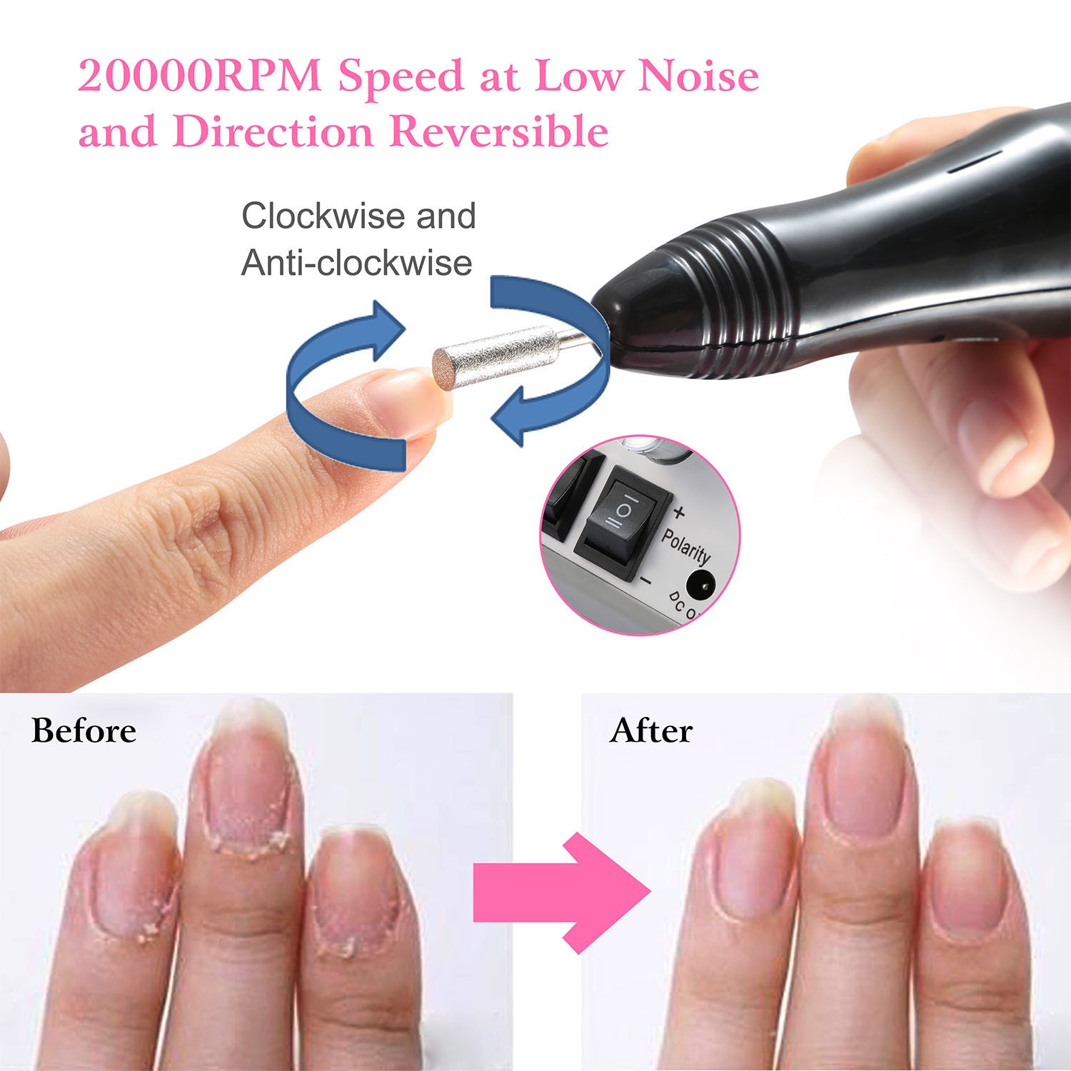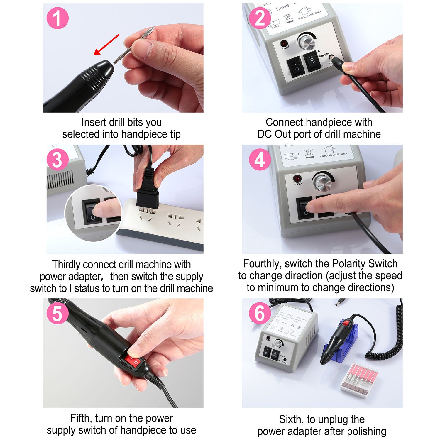 *Easy Installment*:First choose the drill bits you need and insert it into handpiece tip;Secondly,connect handpiece with DC Out port of drill machine;Thirdly switch the supply switch to I status to turn on the drill machine;Fourthly,switch the Polarity Switch to change direction(adjust the speed to minimum to change directions);Fifth,turn on the power supply switch of handpiece to use;Sixth,to unplug the power adapter after polishing.