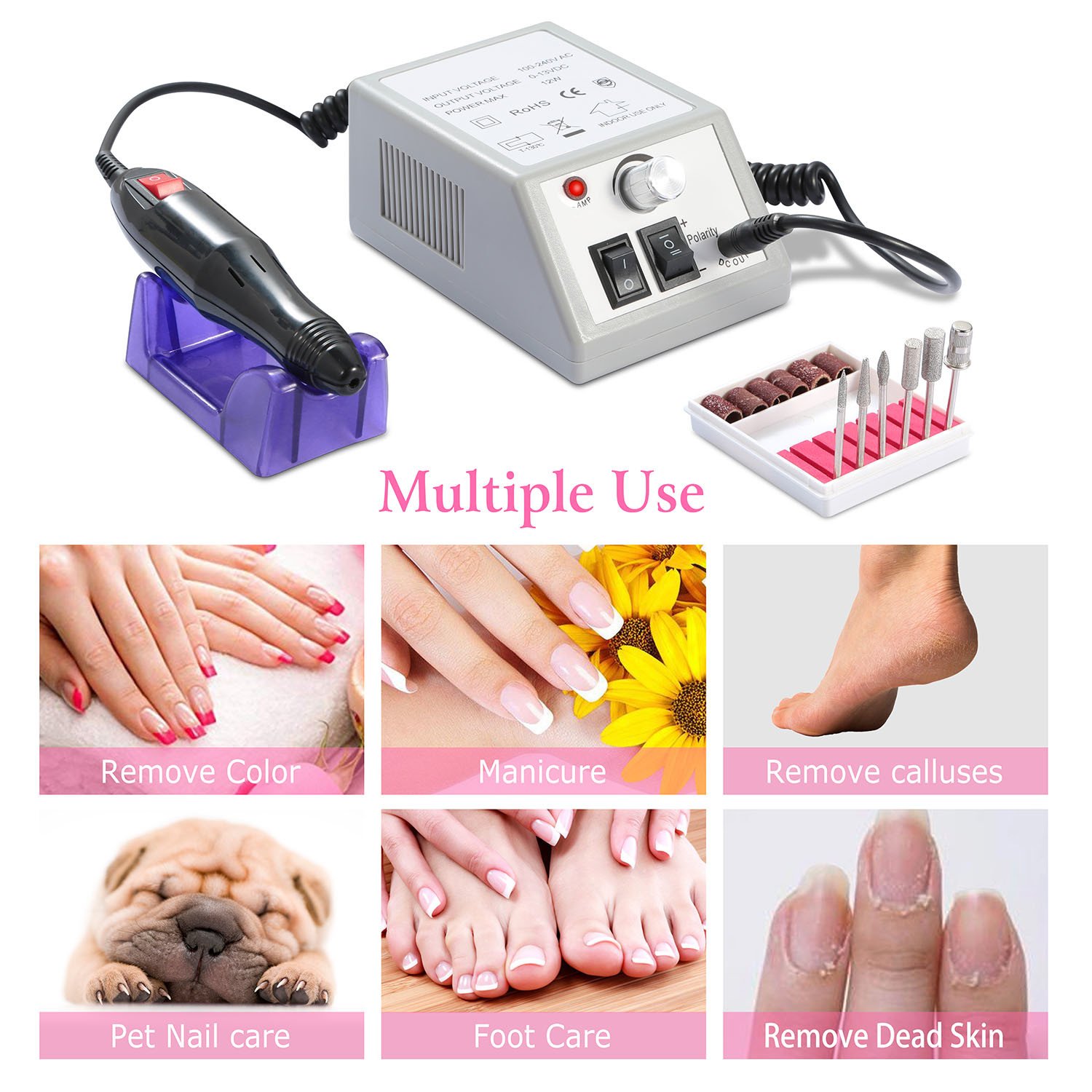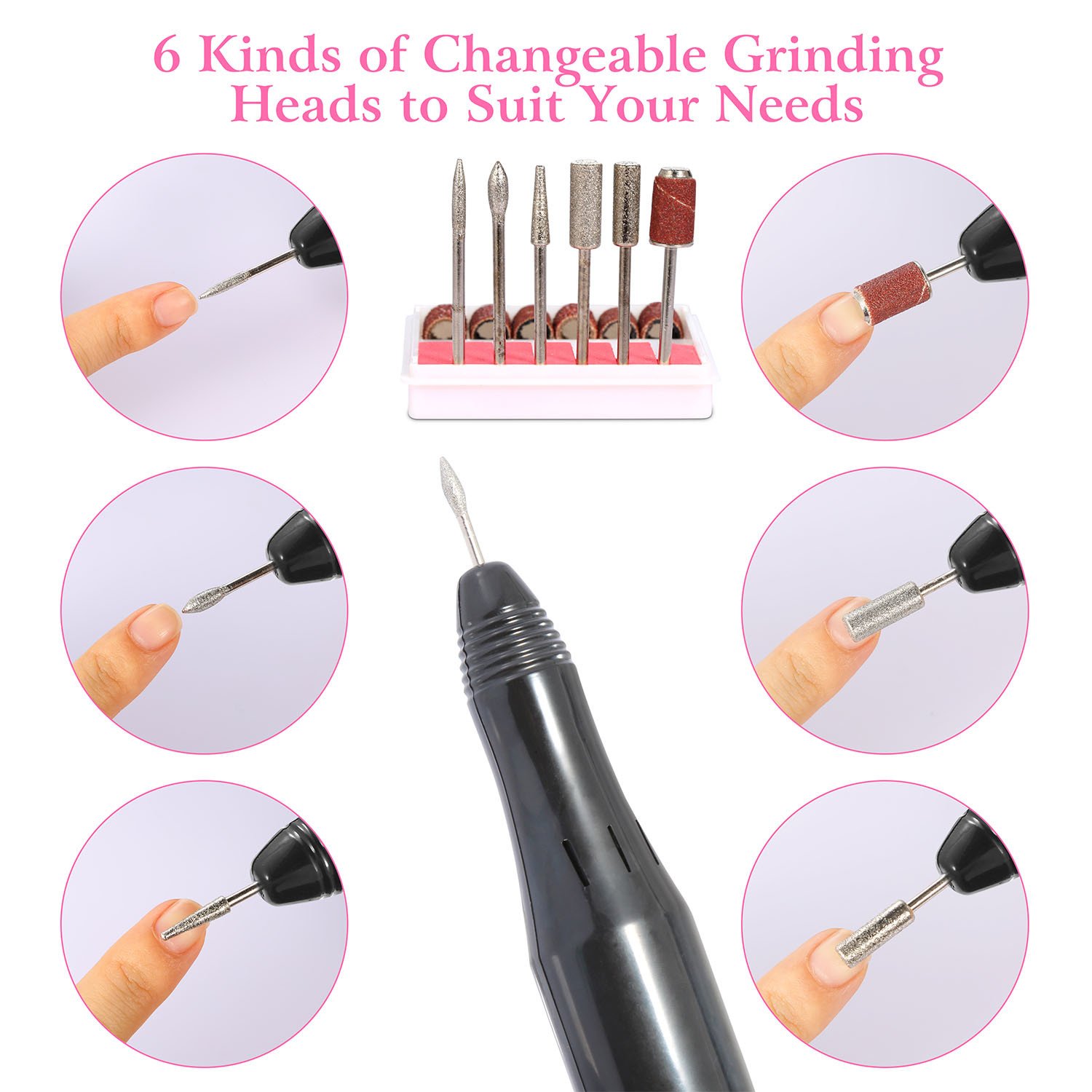 *Professional Acrylic Nail Kit and Multi-purposes*:Comes with 6 metal grinding drill bits,6 sanding bands,convenient for replacement according to your nail shapes,it can not only file,buff,but also smooth corns,calluses and remove excess cuticles. An optimal acrylic nail care kit for exfoliating,grinding,polishing,carving,engraving,routing,sharpening,sanding,etc.